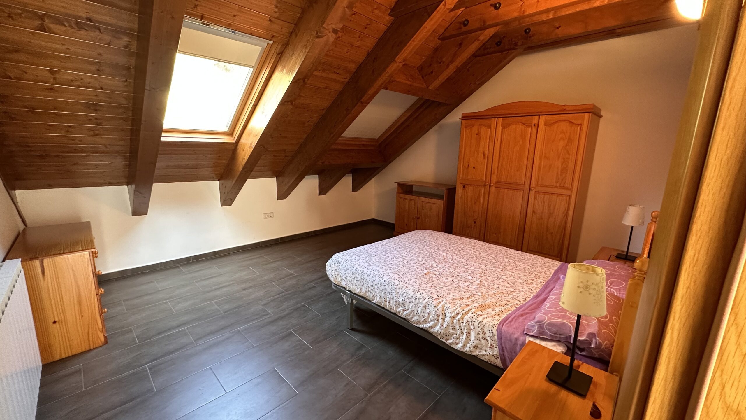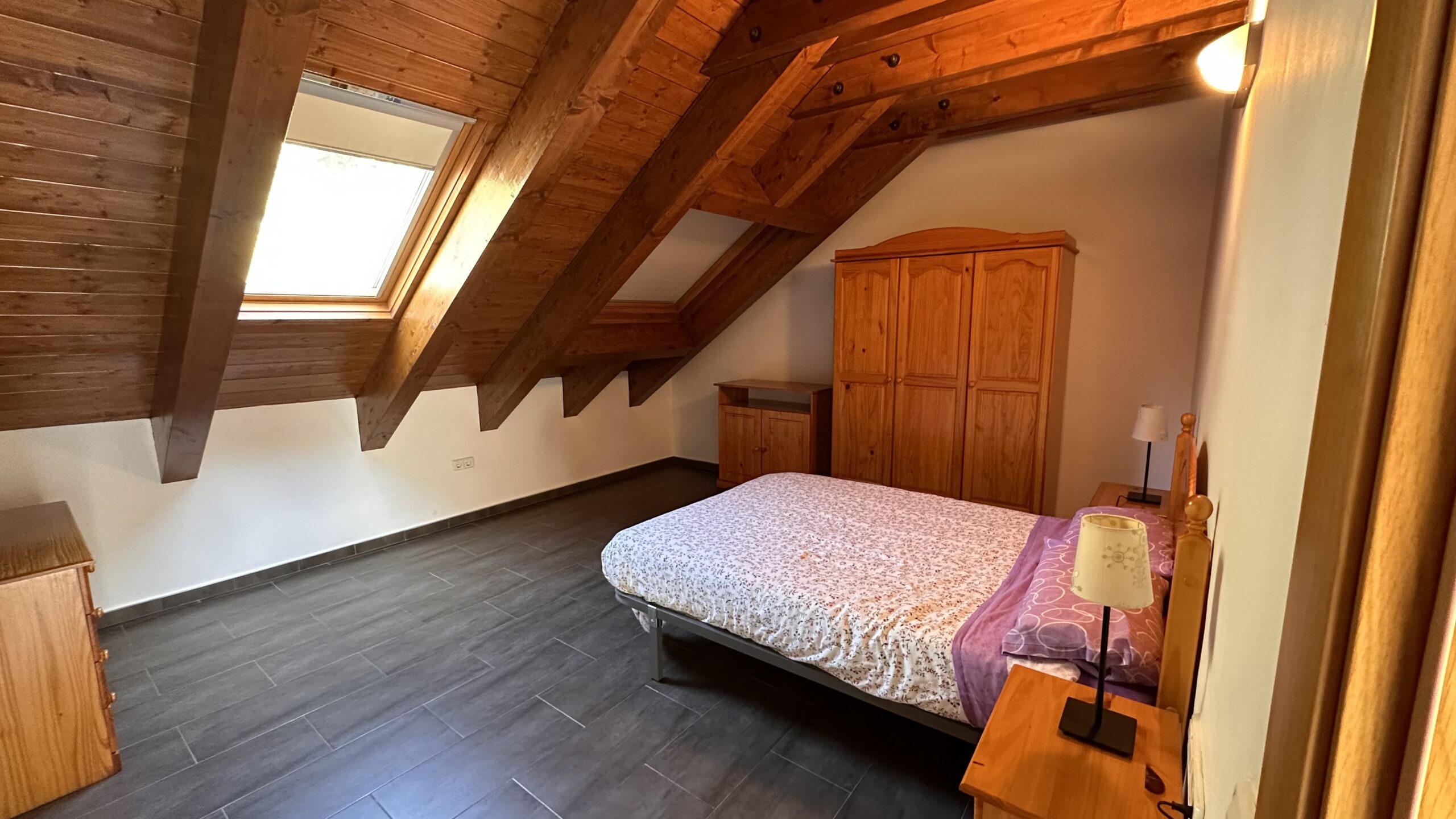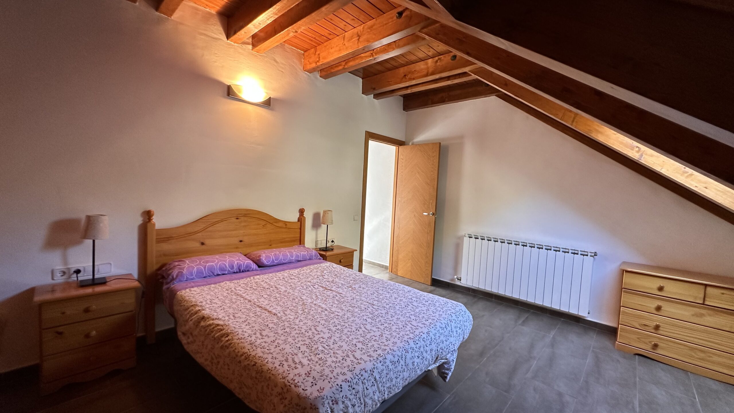 Pujant les escales, trobareu el dormitori principal: un santuari serè sota sostres voltats de fusta, prometent nits de descans profund. El mobiliari de fusta massissa, des de l'armari fins a les tauletes de nit, evoca l'essència de la vida a la muntanya, mentre que la finestra del sostre emmarca les estrelles, afegint-hi un toc màgic a l'habitació.