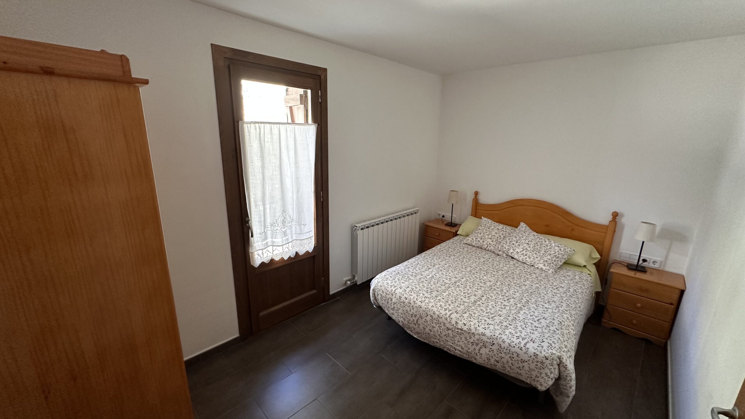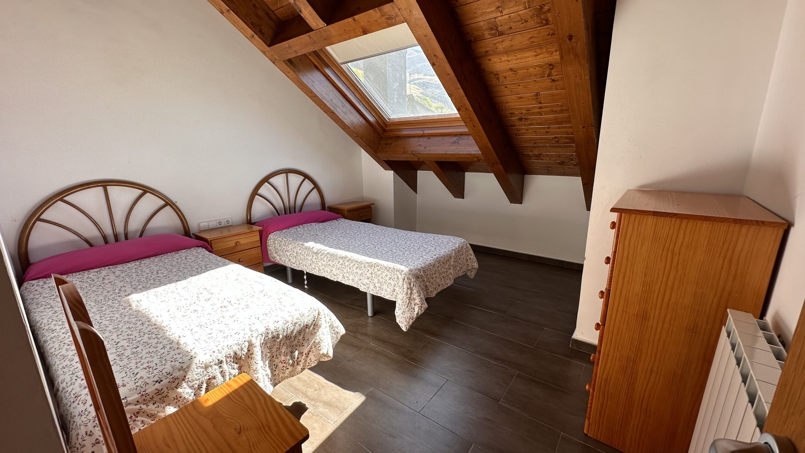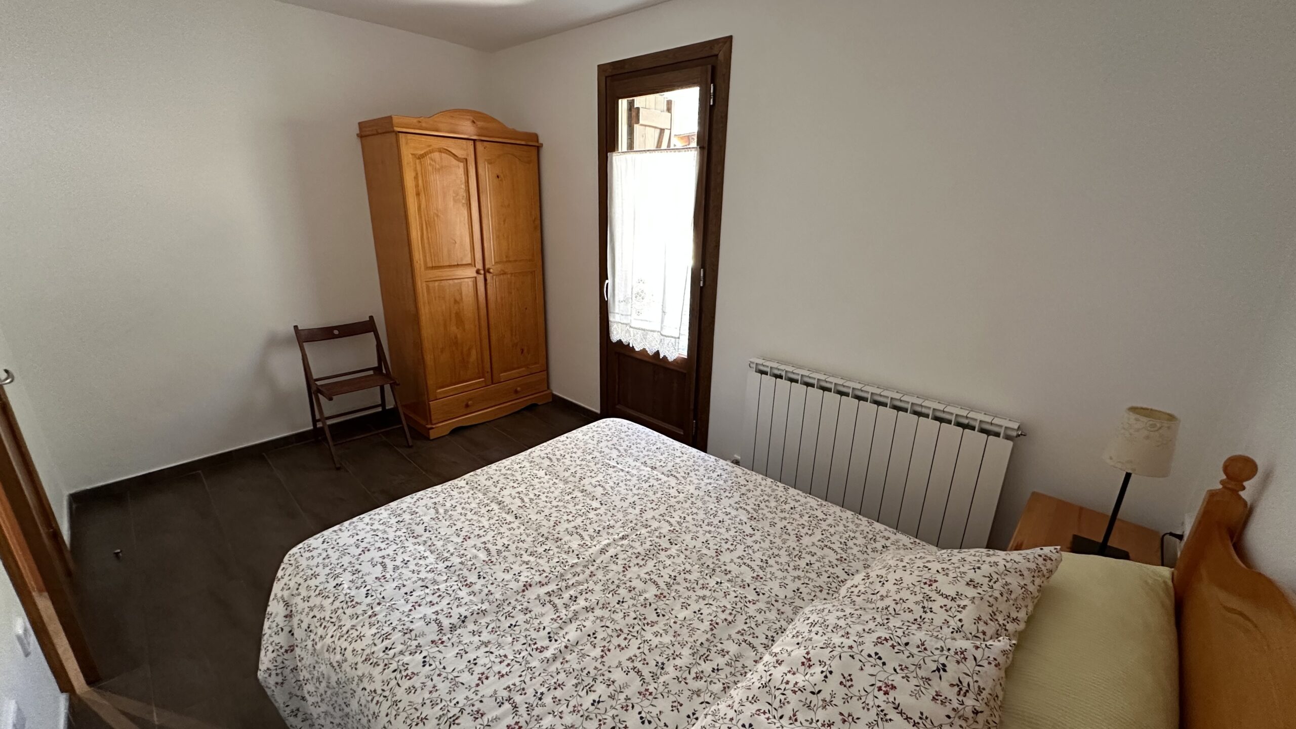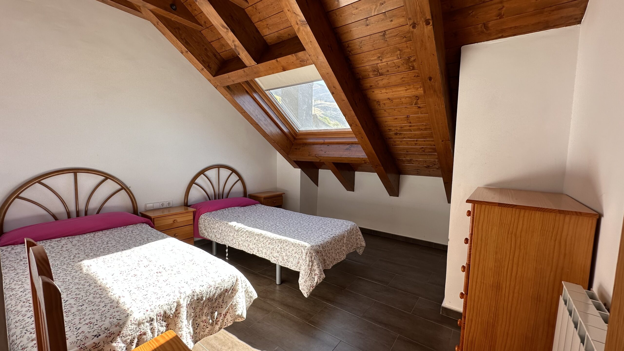Pujant les escales, trobareu el dormitori principal: un santuari serè sota sostres voltats de fusta, prometent nits de descans profund. El mobiliari de fusta massissa, des de l'armari fins a les tauletes de nit, evoca l'essència de la vida a la muntanya, mentre que la finestra del sostre emmarca les estrelles, afegint-hi un toc màgic a l'habitació.