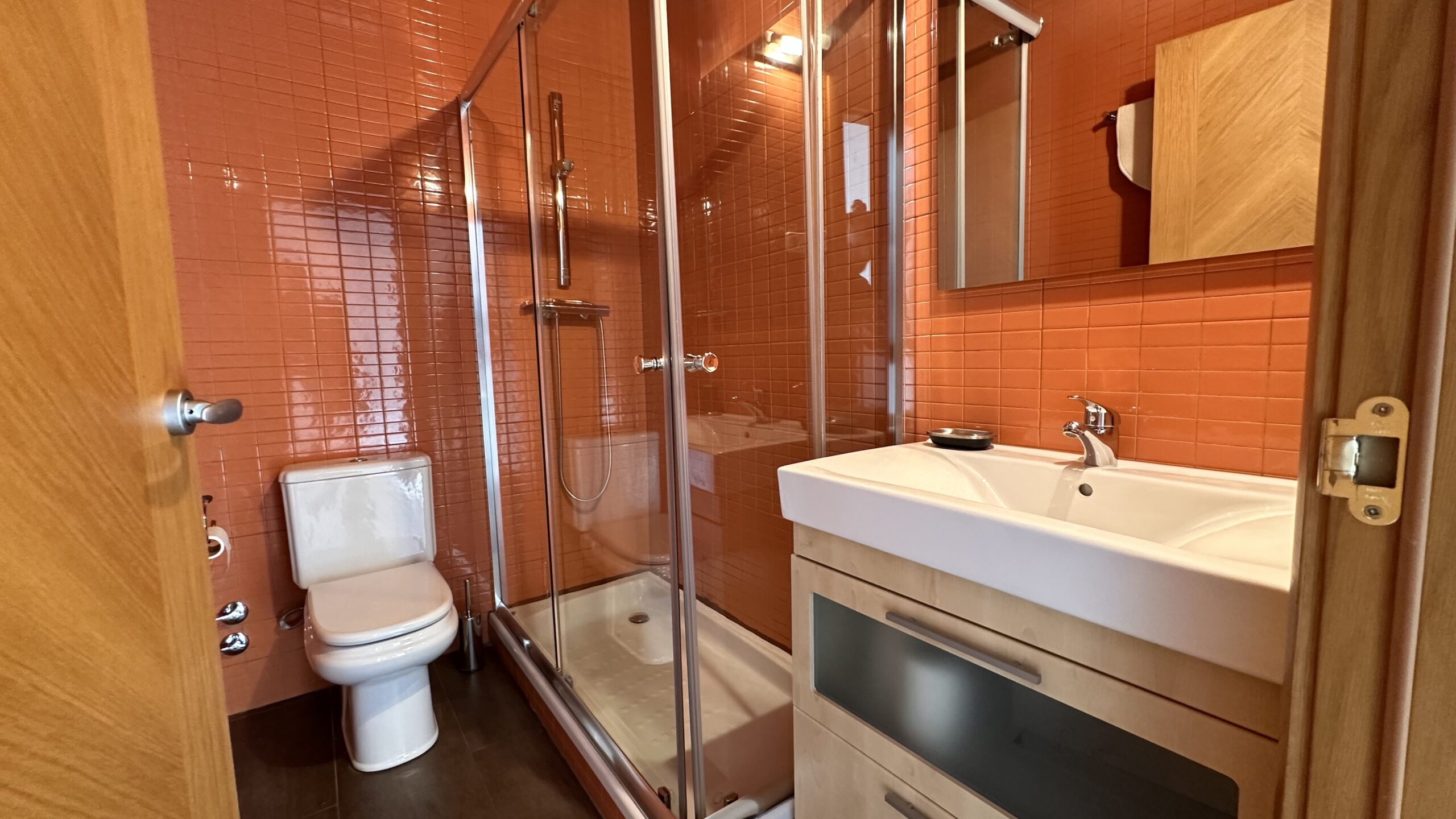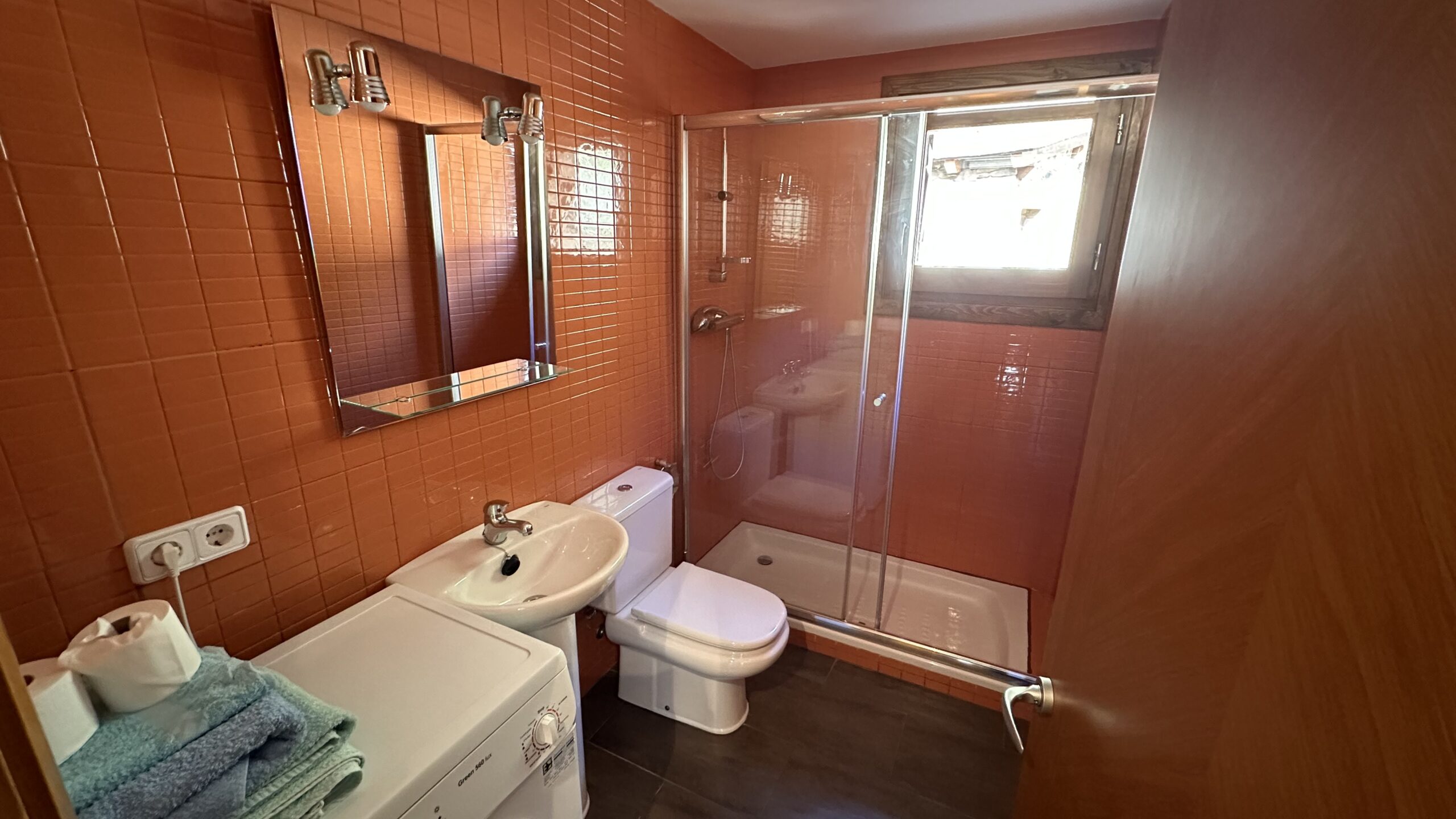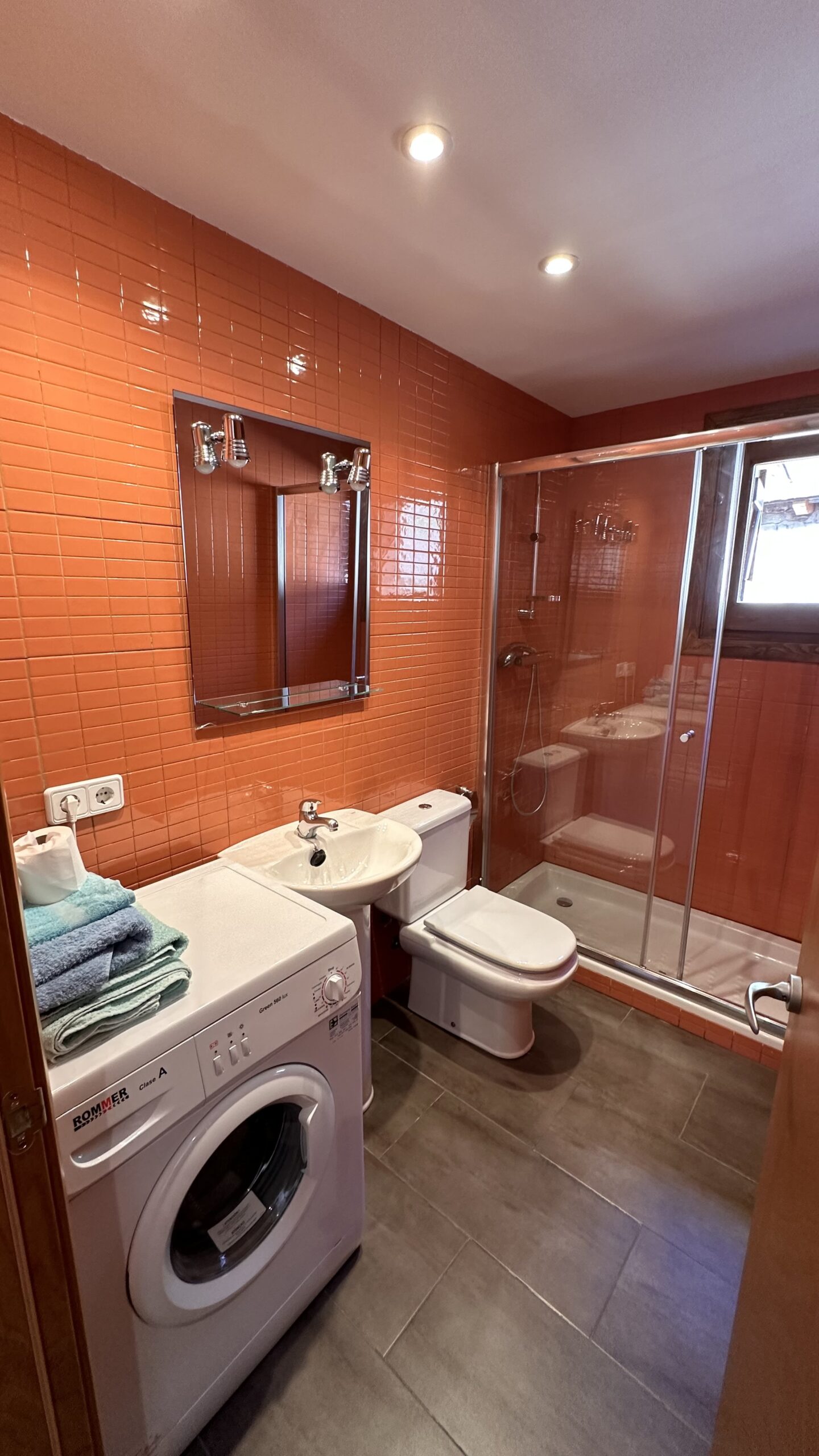 El bany, de rajoles terracota, combina funcionalitat amb un toc de luxe, oferint una dutxa àmplia, un lavabo amb mirall i la comoditat addicional d'una rentadora, garantint que totes les necessitats de la vostra estada estiguin cobertes.